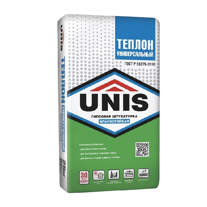 Влагостойкая гипсовая штукатурка Unis Теплон универсальный предназначена для выравнивания стен и потолков внутри помещений с умеренной и повышенной влажностью. Она идеально подходит для сплошного выравнивания стен (от 5 до 40 мм) и частичного (до 60 мм), а также для выравнивания потолков (до 20 мм). Штукатурка подходит для последующей отделки, включая оклейку обоями, окрашивание и облицовку плиткой, и может быть нанесена как вручную, так и с помощью машинного оборудования.